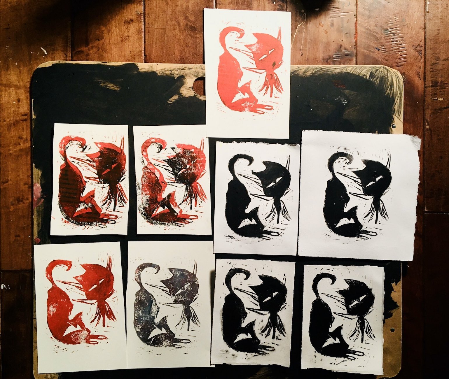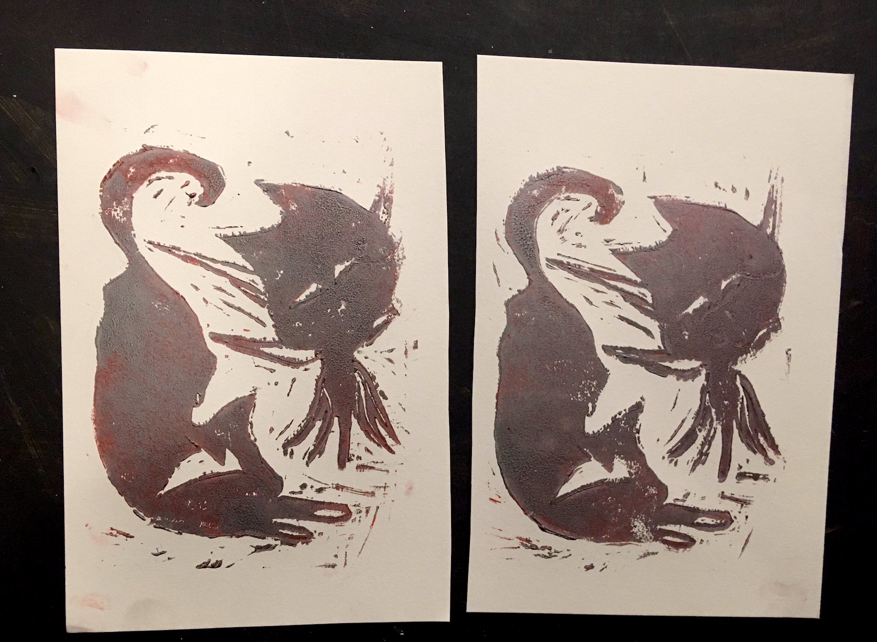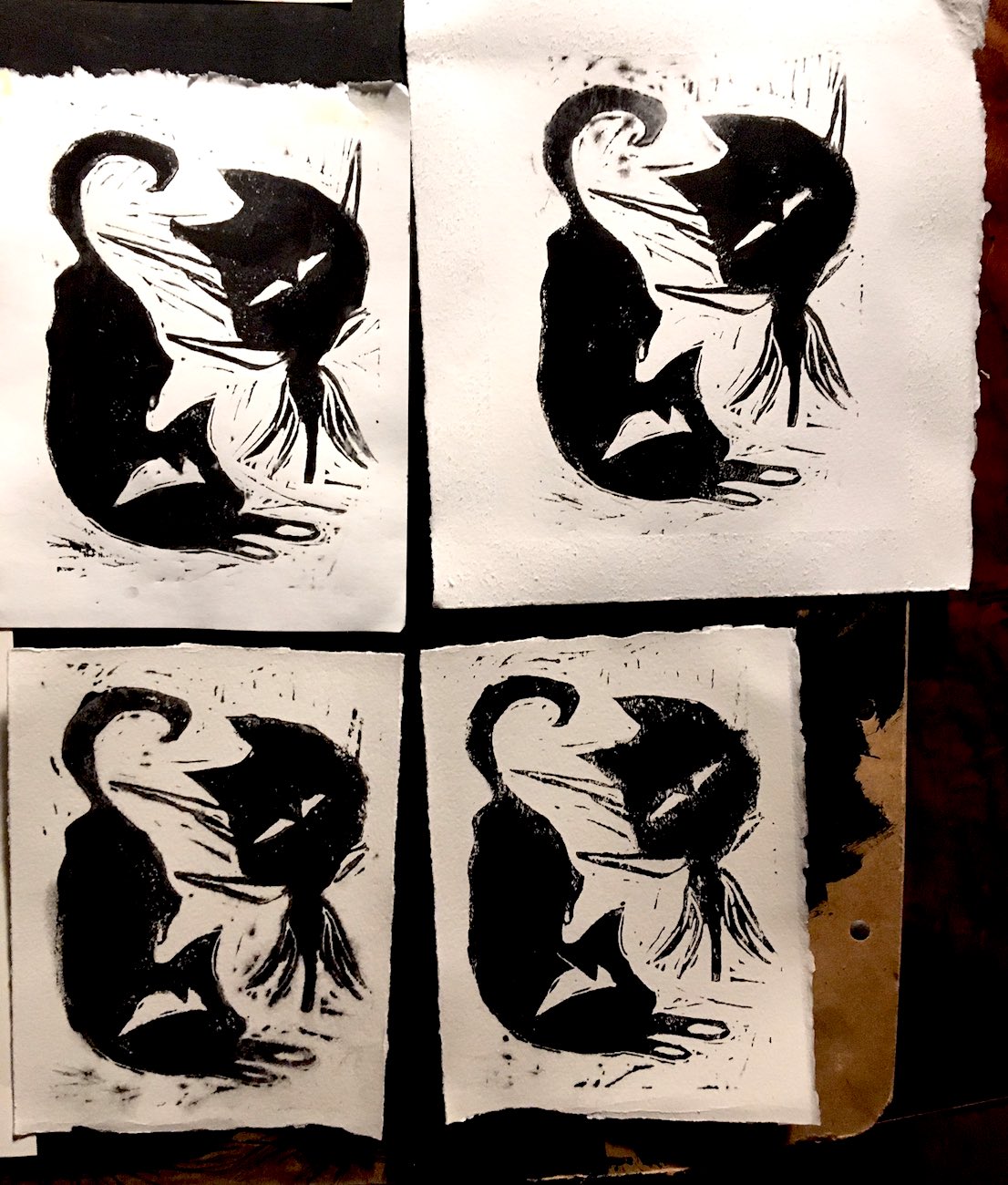 these little lino carving prints are on 5x7 paper with little size varieties due to the type of paper used (arches)