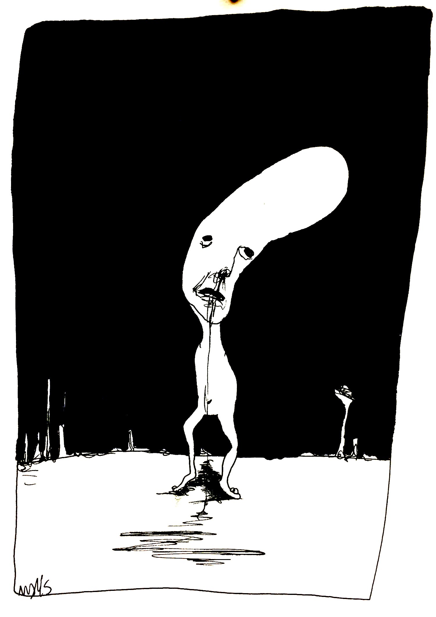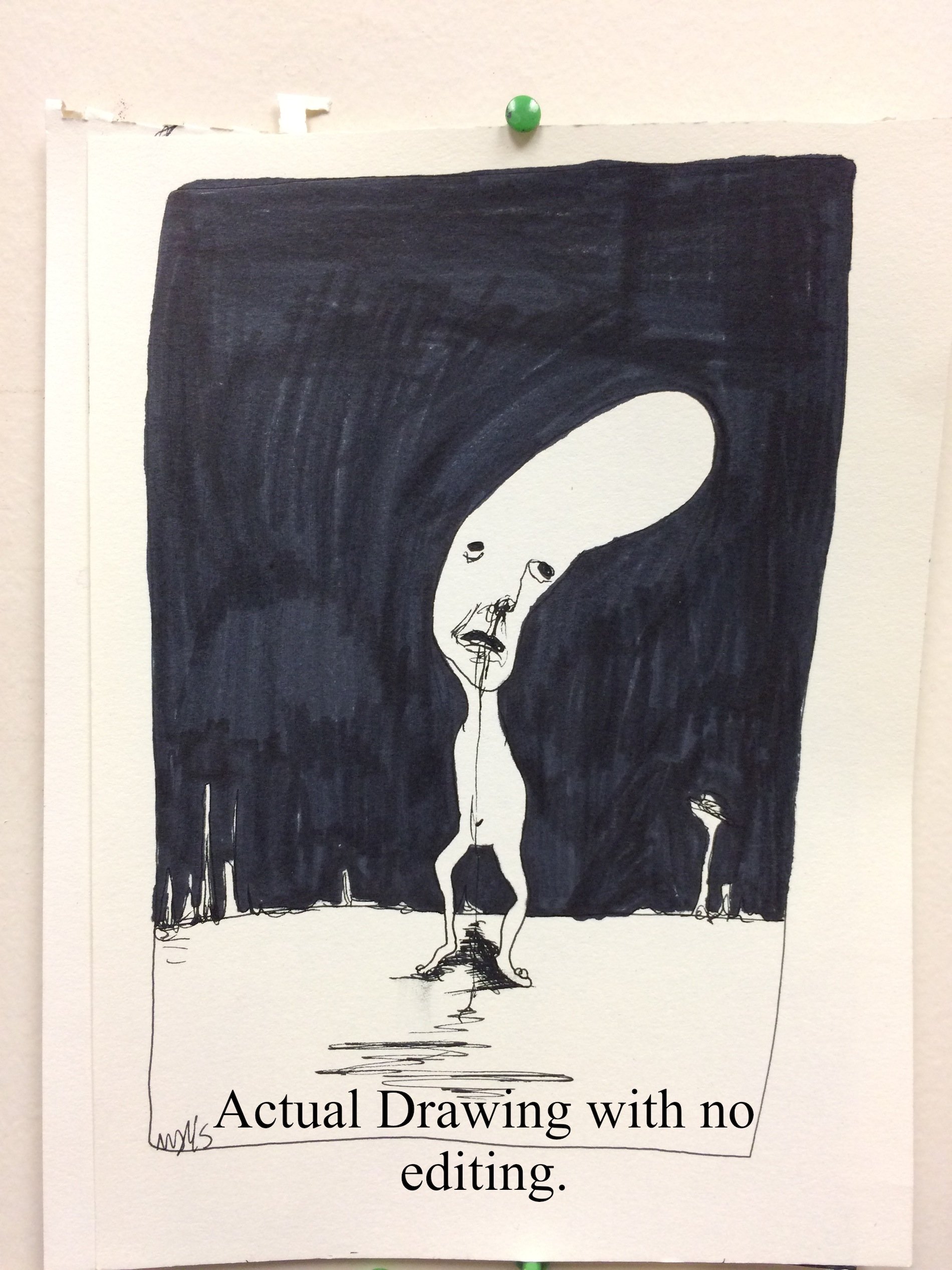 A 8x6 ink drawing of a lone bighead who has a minor nosebleed. He'll be ok!